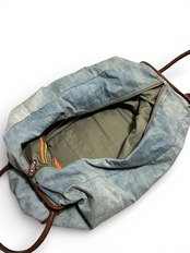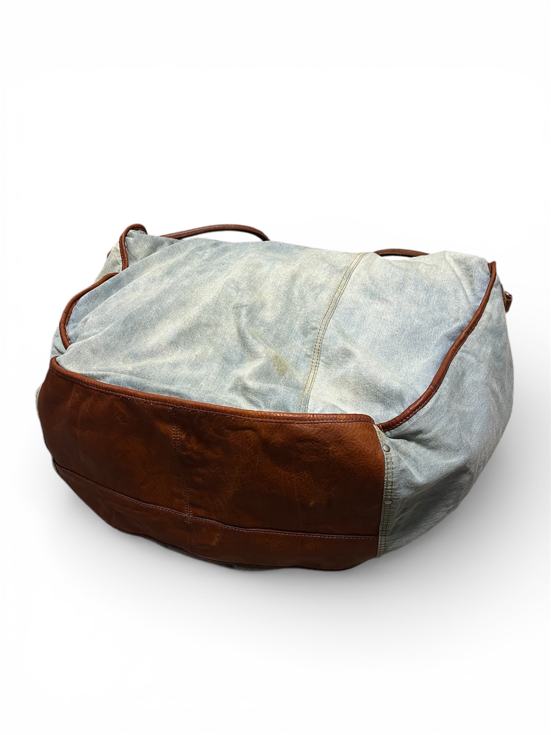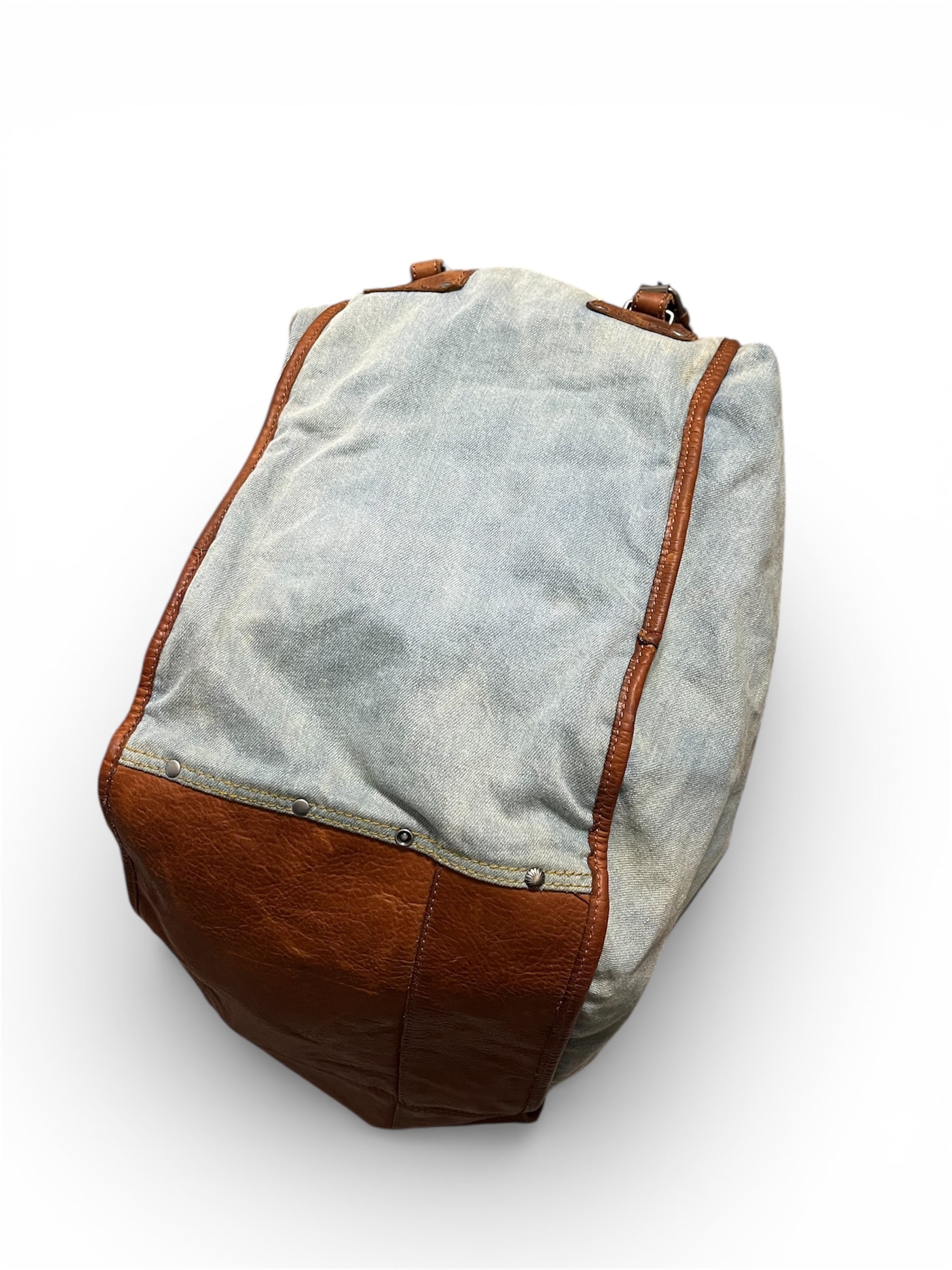 デニム生地にブラウンレザーを掛け合わせたデザインが、カジュアルながら存在感のある表情に。